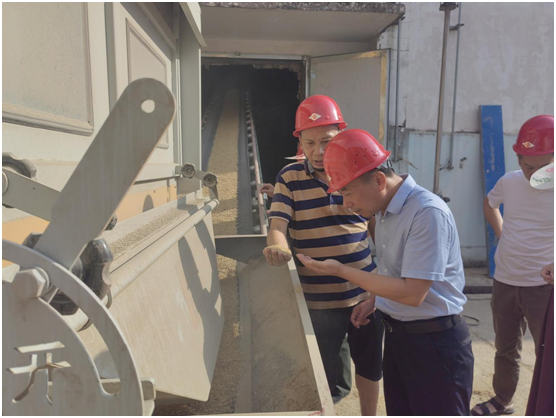 隨后,按照夏糧收購流程,雨民董事長全程考察了現(xiàn)場各個作業(yè)環(huán)節(jié),并聽取了三塘公司今年政府儲備糧輪換收購的情況匯報。在卸糧口,雨民董事長抓取輸送機上稻谷查看今年收購入庫稻谷質(zhì)量,再三強調(diào)必須把好新糧入庫質(zhì)量關,并叮囑現(xiàn)場作業(yè)人員一定要規(guī)范作業(yè),確保人員安全。